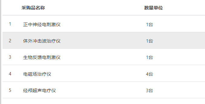 采购品信息:正中神经电刺激仪、体外冲击波治疗仪、生物反馈电刺激仪、电磁场治疗仪、经颅超声电疗仪